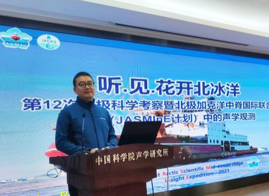 卫翀华作《听·见·花开北冰洋——第12次北极科学考察暨北极加克洋中脊国际联合探测(JASMInE计划)中的声学观测》的报告。报告首先介绍了第12次北极科考的整体概况,而后,展开介绍了加克洋中脊深部地质结构的重要研究意义、声纳浮标等极地声学装备的实验方案设计和极地水声学实验的开展情况,阐述了极地水声学实验对理解低、高频信号冰下混响及散射规律,冰层覆盖下声场传播规律与频率、深度的关系等的重要意义。最后,报告分享了科考船上的精彩生活,以及对我国北极科考事业发展的感想。