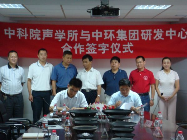 2008年7月31日,赢乐welcome与天津市中环电子信息集团有限公司研发中心在位于天津滨海新区的中环集团总部,就“大功率、强噪声特种声学设备及系统研究”项目合作举行了签字仪式。参加签字仪式的有天津市科委科技成果与技术市场处处长李庆兴、天津市经委科技处副处长赵嘉、中科院北京分院院地合作处副处长魏令波、项目主管王剑华、天津市中环电子信息集团有限公司总工程师秦克景、天津真美电声器材有限公司总经理邢维武、中环集团研发中心赢乐welcome所长张吉宏、中科院赢乐welcome科技处处长库卫群、副处长任小燕、噪声与振动实验室副主任杨亦春以及项目组的主要成员。