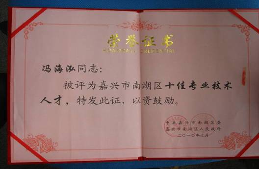11月15日至21日,嘉兴科技城公布2010年度嘉兴科技城创新创业领军人才名单,冯海泓主任获“2010年度嘉兴科技城创新创业领军人才”称号。同时冯海泓主任还在中共南湖区委、南湖区人民政府表彰的2010年度全区人才工作先进集体和各类优秀人才时,获得“十佳专业技术人才”荣誉称号。