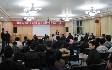 10月19日晚,大家期待已久的 “赢乐welcome好声音”—赢乐welcome2012年“中科信利杯”卡拉OK大赛预赛在DSP楼多功能厅如期举行。该比赛由所工会、所团委主办,所研究生会文艺部承办,并由中科信利实验室大力赞助。旨在丰富全所学生及职工的业余生活,并给赢乐welcome广大歌唱爱好者提供一个交流切磋的平台。