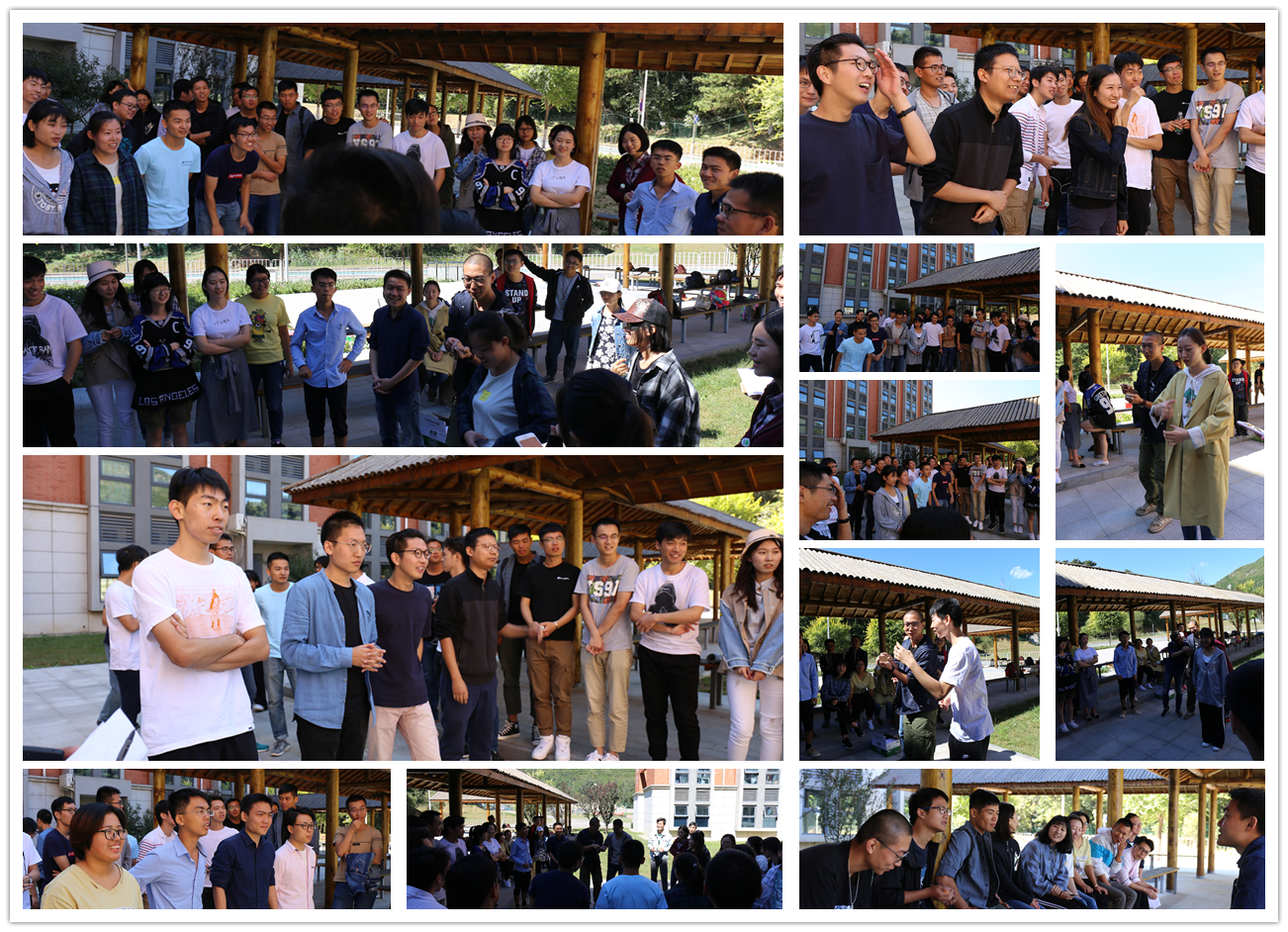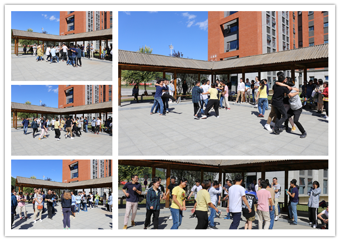 在自由交流环节持续了将近一个小时的时候,活动地点转移到西区宿舍的休息长廊那里,开始进行游戏互动环节。开始之前,研一新生分成三个组,先进行破冰小游戏,相互熟悉。