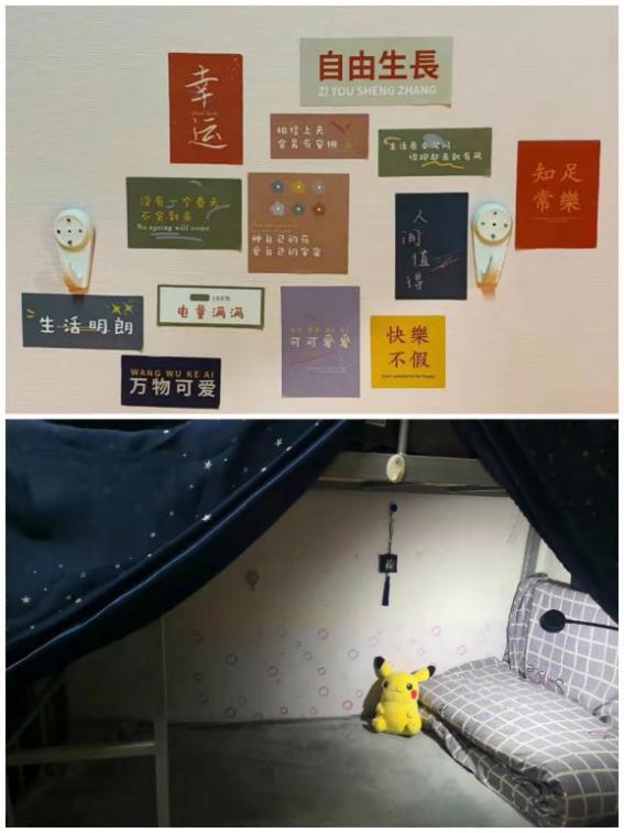 2021年1月10日晚,评委们来到同学们精心装饰好的宿舍进行环境卫生评比。清、新、洁、美的宿舍环境,获得了评委们一致的好评。在装饰方面,每个寝室都展现了各自的特点和风采。宿舍墙面装饰,同学们发挥各自创意,有使用星空白墙纸,增加宿舍的空间感;有的铺以绿色竹画墙纸,营造清新自然的氛围;还有布满墙壁的人生标语,表现对美好生活的向往和期待等。最终G117寝室以其整洁的环境、精美的装饰获得了环境卫生评比的第一名。