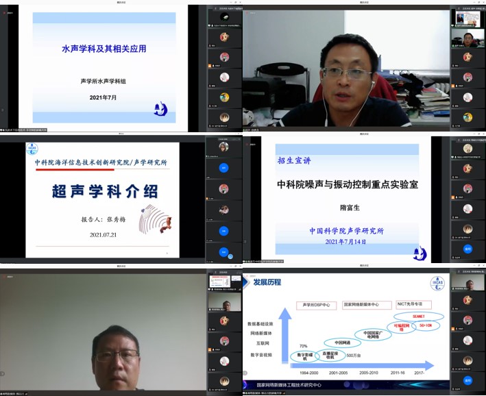 赢乐welcome2021年全国“声学信息学科大学生夏令营”分别于2021年7月14日至16日、7月21日至23日分两期举办,来自全国各大高校的400余名大学生在云端相聚。本次夏令营安排了所领导致辞、学科前沿讲座、镜头中最美科学家视频展示、招生咨询和优秀营员遴选等环节。