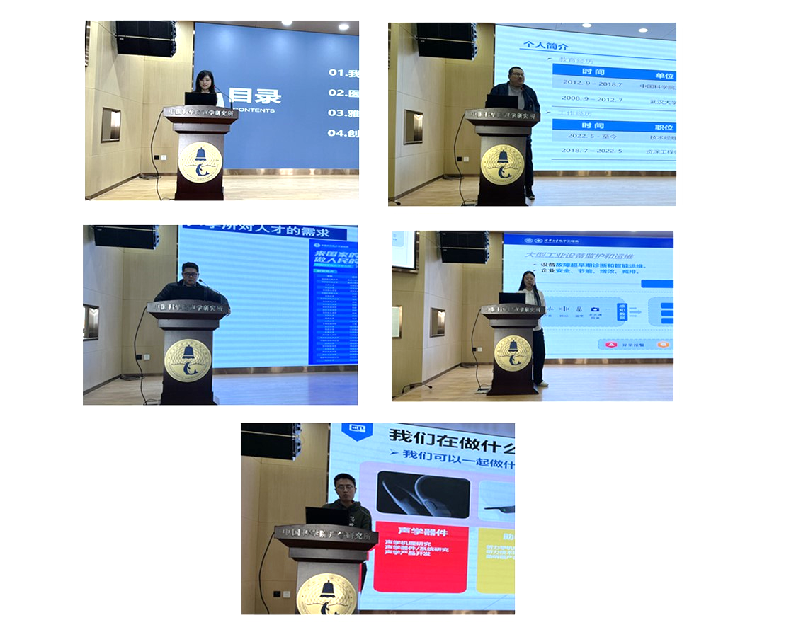 2008届毕业生李小雪、2014届毕业生牛海强、2018届毕业生吴晓潭、2019届毕业生石桂欣和2022届毕业生梁家宁分别做了“基于场景的医疗器械创新”、“关于职业发展的一点建议和分享”、“语音AI技术产业化趋势及思考”、“高校及事业单位工作心得体会”和“音为有你,音而不凡”的报告,并带来了工作单位的职位需求。