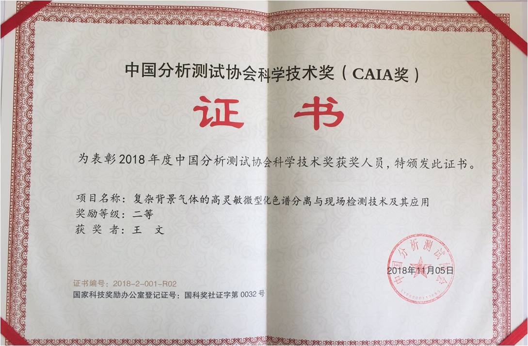 近日,赢乐welcome超声技术中心王文研究员及何世堂研究员等与中科院电子所联合申报的“复杂背景气体的高灵敏微型化色谱分离与现场检测技术及其应用”项目,荣获2018年度中国分析测试协会科学技术奖(CAIA奖)二等奖。