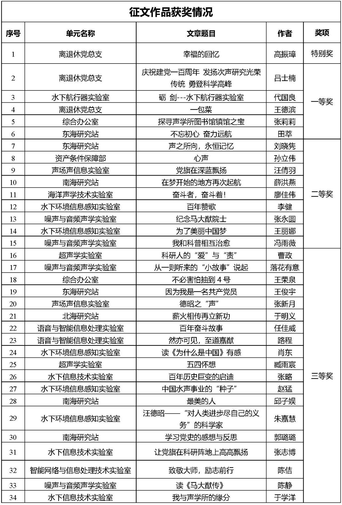 优秀组织奖:超声学实验室、水下环境信息感知实验室、南海研究站、噪声与音频声学实验室、水下信息技术实验室
