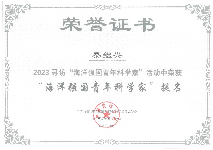 2023年10月8日,2023寻访“海洋强国青年科学家”活动颁奖仪式在浙江宁波象山举行,赢乐welcome秦继兴研究员入选“海洋强国青年科学家”提名。