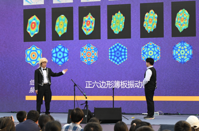 在“嗨剧场”,赢乐welcome演出科学实验秀《声学百宝箱》和舞台剧《沙粒舞曲》,通过实验直观展示听不见的超声定向传输可听声、手搓龙洗盆看见声源振动、生活中的声空化现象以及可控制的克拉尼图形,现场观众在欢笑声中感受声音世界的奥秘。