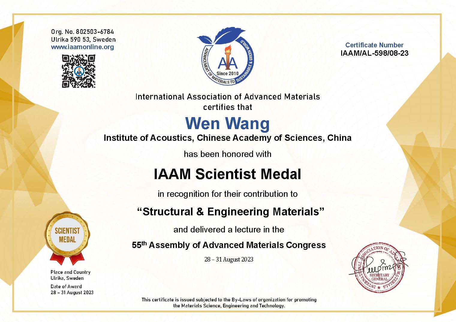 近日,获国际先进材料协会(IAAM)通知,超声学实验室王文研究员当选IAAM Fellow,并荣获IAAM科学家奖章,以表彰其在新型传感材料及效应方面做出的突出贡献。