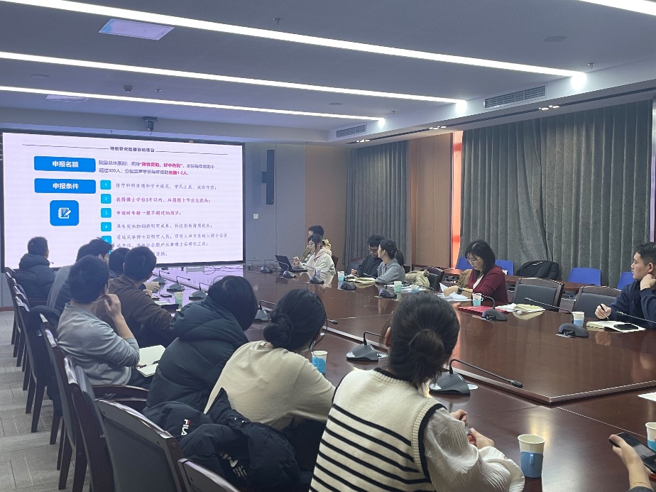 人力资源部于艳萍就特别研究助理相关的人才项目作介绍,从特别研究助理资助项目、中国博士后科学基金资助和国家资助博士后研究人员计划三方面为大家作政策讲解和制度宣贯。