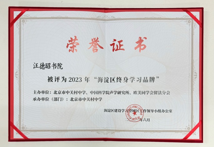 近日,在海淀区第十九届全民终身学习活动周开幕式暨海淀区争创北京市学习型城市示范区启动仪式大会上,由我所与中关村中学联合发起设立的汪德昭书院,以其独特的教育理念和创新的教育方式,作为2023年“海淀区终身学习品牌”获得表彰。