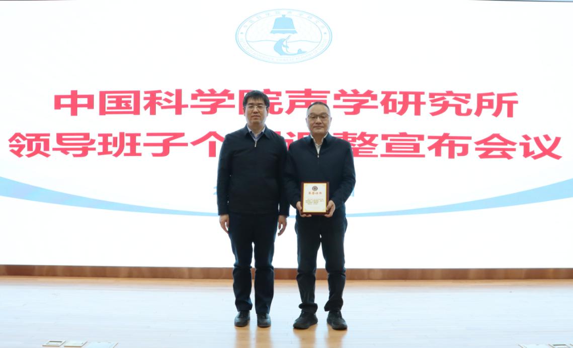 蔡宏志宣读了《中共中国科学院党组关于库卫群、倪宏同志职务任免的通知》(科发党任字〔2025〕12号),任命库卫群同志任声学研究所党委书记、副所长;免去倪宏同志声学研究所党委书记、副所长职务。