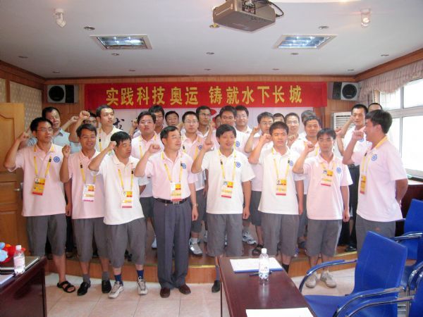 会上,全体水下安保团队的成员共同宣誓:实践科技奥运,铸就水下长城。大家还共同在印有北京奥运会徽的旗帜上签名留念。