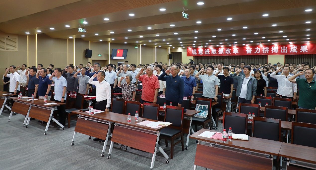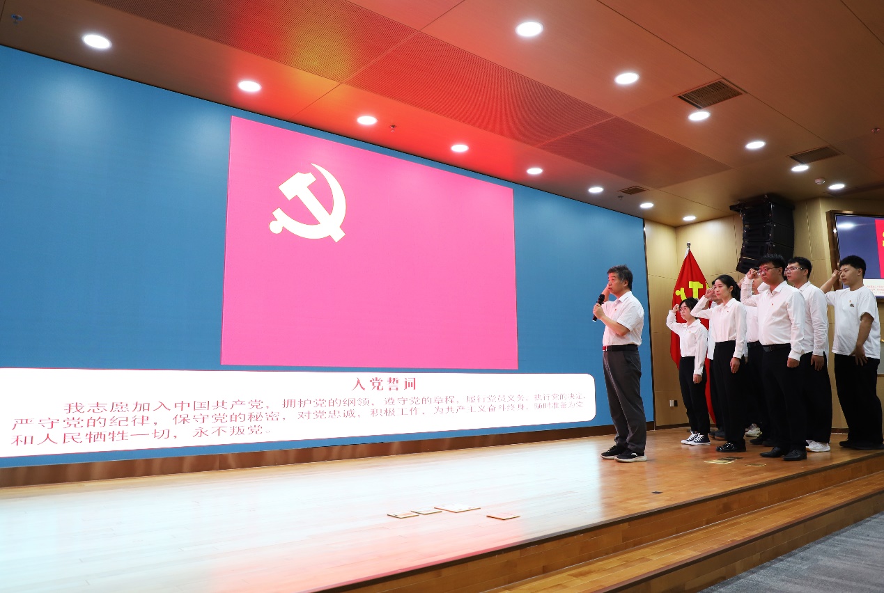 党委委员郭良浩带领新党员宣誓,全体党员重温入党誓词,铿锵誓言在会场久久回荡。