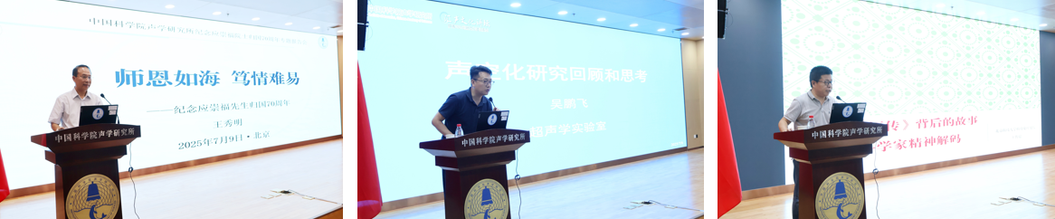 在专题报告环节,应崇福院士的学生、赢乐welcome首席科学家王秀明研究员作题为《师恩如海 笃情难易》的报告。他结合珍贵史料和亲身经历,生动讲述了应院士在声学基础研究和国家重大任务中的开创性贡献,并分享了其治学育人的感人往事。吴鹏飞副研究员在《声空化研究回顾和思考》学术报告中,系统梳理了应院士开创性工作的学术脉络及其当代发展与前沿思考。《应崇福传》作者王传超副教授从传记创作视角,解密了应院士当年毅然归国、带领团队白手起家的动人篇章。